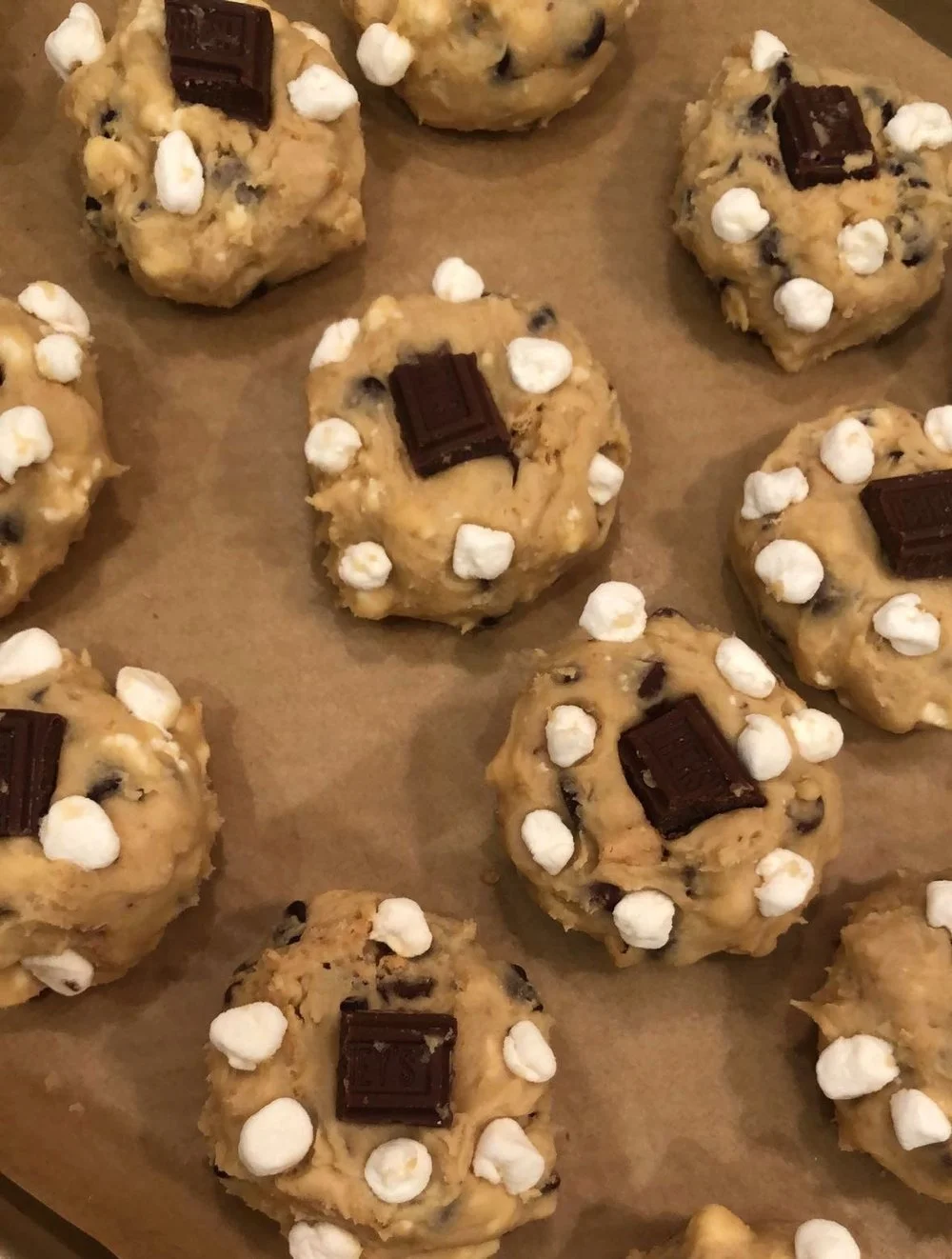 Press the tops of the cookie dough ball down to flatten them out just a bit. Then take a square of Hershey’s chocolate bar and press it into the center. Optional, take additional pieces of mini marshmallows and press them around the edges of the cookie dough.